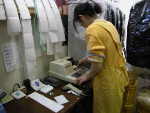 お客様からお預かりした商品をシミや破損ボタン等をチェックしてタッグを商品に取り付けます。